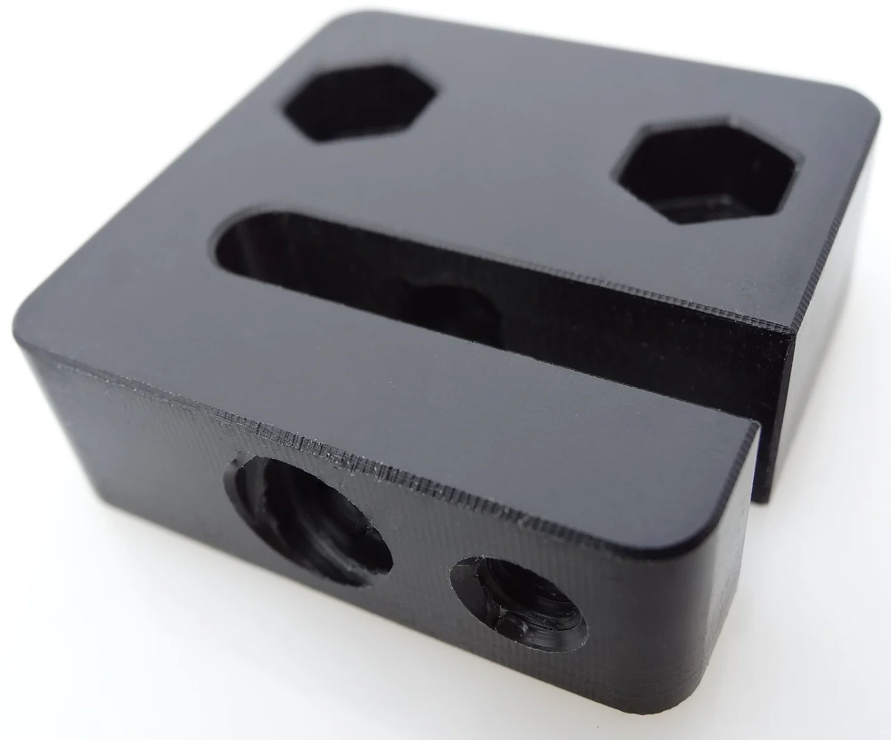 It serves more than one purpose in that it can be mounted to the bottom of a 3mm/1/8" plate utilizing M5 nylon insert nuts and 15mm M5 screws or can also be mounted directly to V-Slot utilizing two channels with 15mm M5 low profile screws and two tee nuts. Â These mounting choices allow for a host of modular machine applications. Â You can mount this block along any length of V-Slot to create your linear motion.
